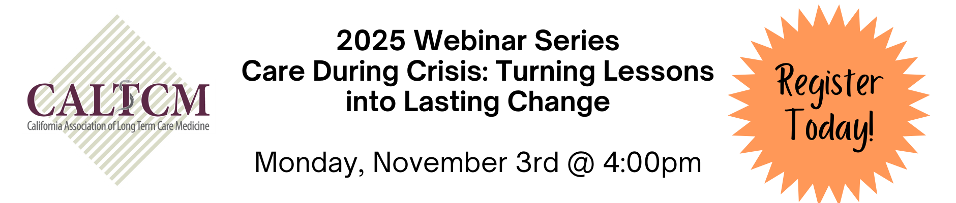 The CALTCM Education and Clinical Practice Committees are excited to announce a new interactive, on-demand educational series designed specifically for medical directors! This series will focus on the key differences between federal and state regulations and offer valuable continuing education hours. Stay tuned for more details on how to enhance your knowledge and leadership in post-acute and long-term care. ![]() |