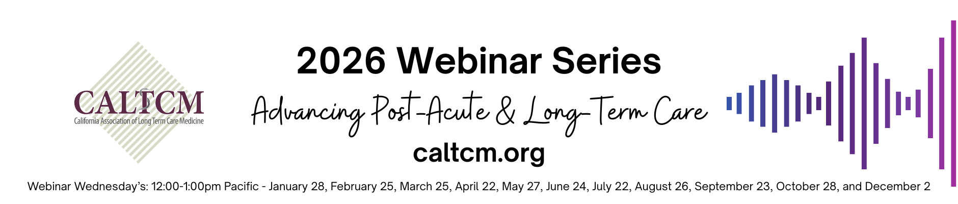 In 2026, CALTCM's Webinar Series is getting a fresh new date and time. As always, the webinar series will remain free to anyone working in PALTC.  Each webinar will give participants the opportunity to learn from thought leaders and discuss hot topics, this is a great opportunity to build your skills and your network!  Continuing Medical Education (CME) and California Board of Registered Nursing (BRN) continuing education credits are offered to eligible participants.